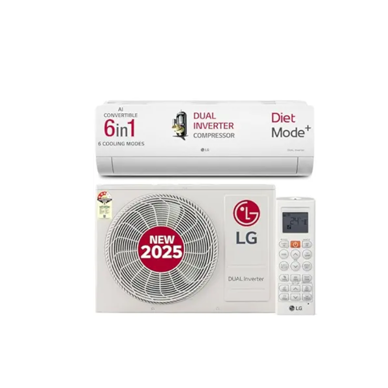 The LG 1 Ton Split AC is an energy-efficient cooling solution with a 4-star rating (ISEER 4.7), ideal for small rooms (up to 110 sq.ft). It features a Dual Inverter Compressor for fast & silent cooling (21 dB indoor noise) and AI Convertible 6-in-1 technology for adaptive cooling. The 100% copper condenser with Ocean Black Protection ensures durability, while the HD Filter with Anti-Virus Protection improves air quality. Additional features include 4-way air swing, stabilizer-free operation (120V-290V), and a 10-year compressor warranty.